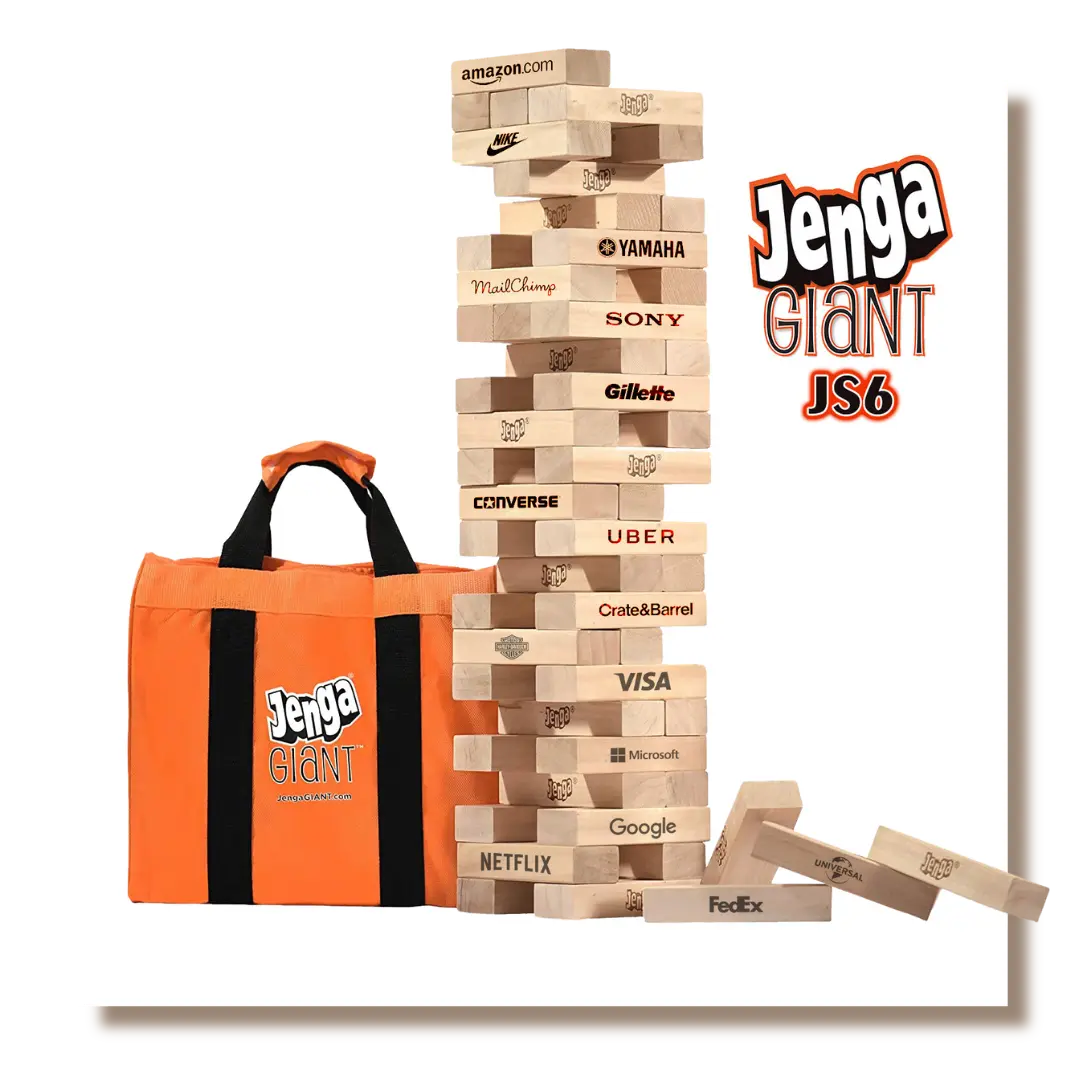 Custom Jenga® Games - An entertainment highlight at family or corporate events, fundraisers, and parties, Custom Engraved or Personalized! Authentic custom Jenga® GIANT™ JS7™ Hardwood Game is the biggest original authentic hardwood Jenga® brand game ever sold! Starts at 2 feet high at setup and can stack to over 5 feet high in play - all with your custom company logo or personalization!