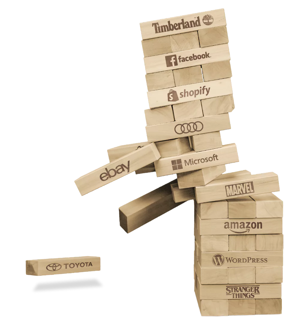 AT JENGA® CUSTOM LOGO, WE’RE MORE THAN JUST GAMES, WE ARE POWERED BY LOGOBOSS - A FULL SERVICE PROMOTIONAL PRODUCTS COMPANY WITH IN HOUSE DECORATING AND CUSTOM CLOTHING. AT JENGA® CUSTOM LOGO, WE ARE THE ONLY AUTHORIZED JENGA® GAMES DECORATOR AND RESELLER.